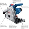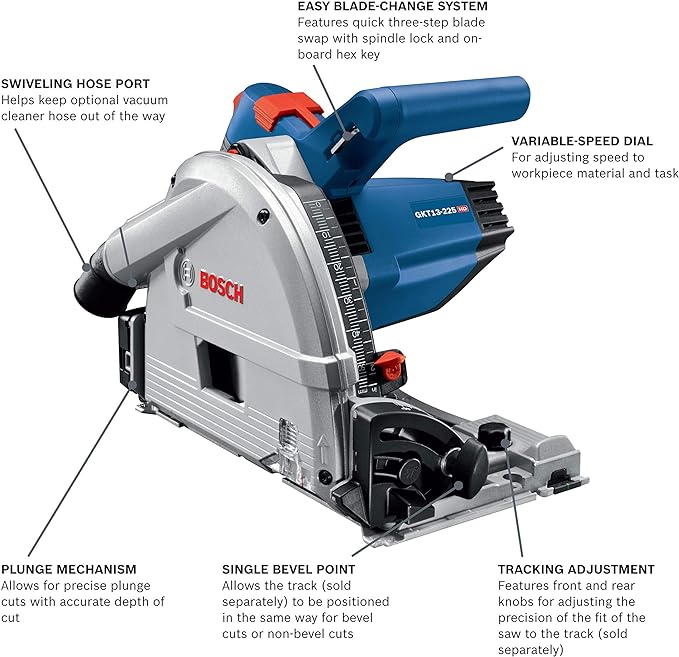 The Bosch GKT13-225 Track Saw with Plunge Action delivers precision and power, ideal for making table-saw quality cuts to wood and wood-based sheet goods such as laminated particle boards and plywood. The track-guidance system provides exact adjustments for precision end-to-end cuts and plunge cuts. The saw and track combination makes it a more easily transportable alternative to a table saw. The precision of the track saw and blade combine with the optional Bosch tracks (sold separately) to deliver a straight fast finish cuts. The saw is engineered to fit precisely to the tracks. The saw includes constant electronics to help maintain speed under load. The saw also features a spindle lock, a swiveling hose port and a lock-off mechanism. It features overload protection. It has a single pivot point for both bevel and non-bevel cuts, from -1° (for slight undercuts) to +47° cuts. It allows for efficient dust extraction when connected to a suitable vacuum cleaner. The GKT13-225L Kit includes a 48-tooth 6-1/2 In. track saw blade, blade-change wrench, and an L-Box case. Bosch offers a full range of optional attachments, including four different track lengths, connector for connecting multiple tracks, an angle guide and a rip fence.